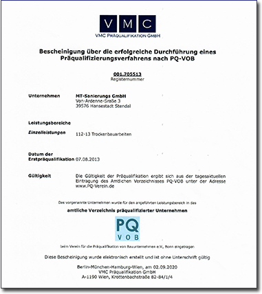 “Unternehmen des Bauhaupt- und Baunebengewerbes können bei den vom Verein beauftragten Präqualifizierungsstellen ihre Eignung für öffentliche Bauaufträge in Deutschland mit einer Präqualifikation nachweisen. In dem Fall geben die Unternehmen den Vergabestellen unter Angabe der Registriernummer bekannt, dass sie präqualifiziert sind.”